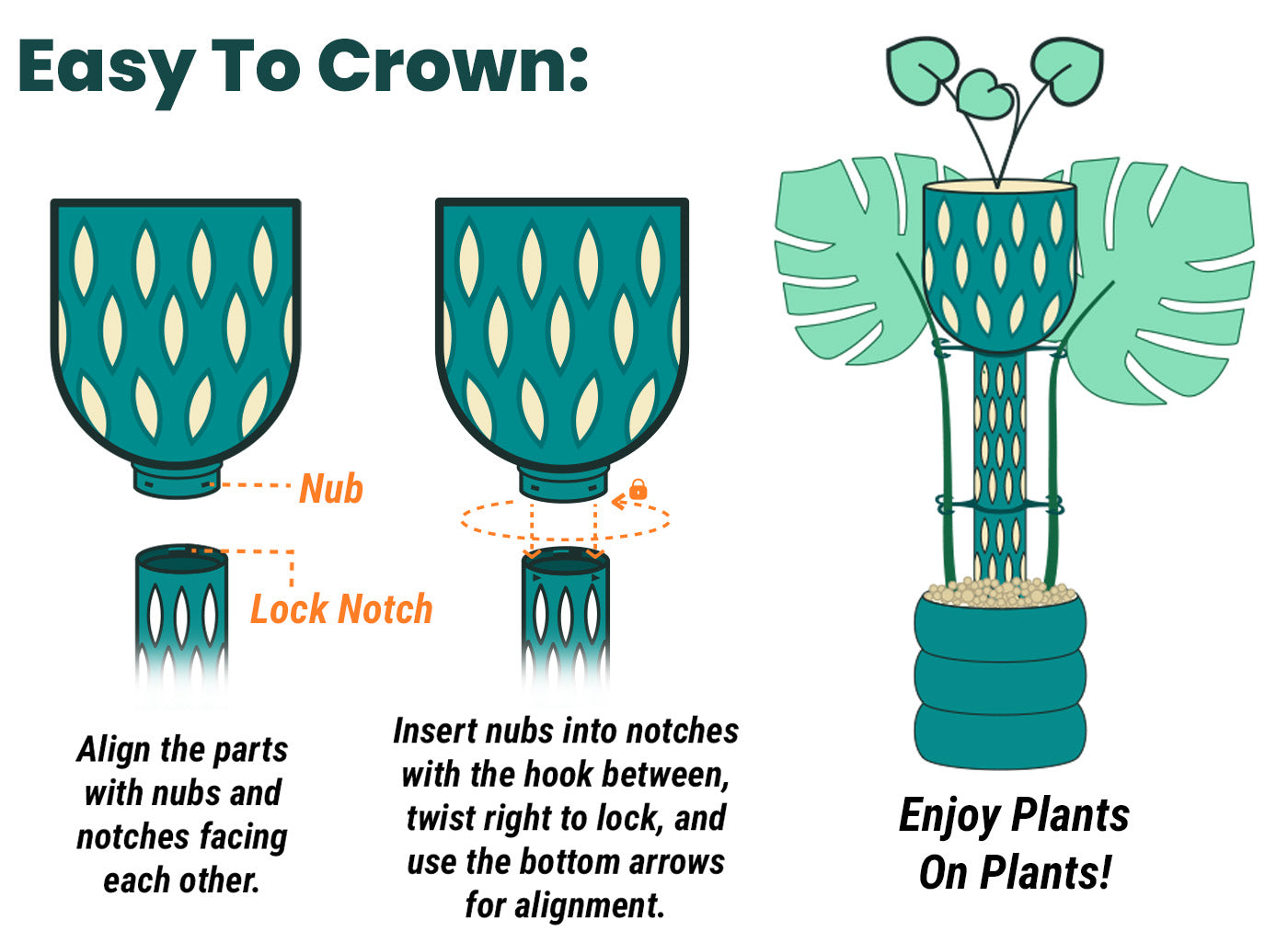 Choose the pieces you want to connect your Crown Pot to either a Buildable Moss pole or Table Top Drip Tray. Each piece uses three nubs that align with three matching twist lock notches.