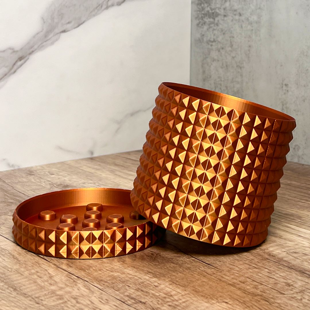 This Unique 3D Printed Studded Round Planter is a delightful gift tailored for nature aficionados aiming to enhance their indoor spaces with sophistication and verdant charm. Whether embellishing your living area, bedroom, or workplace, this planter effortlessly complements succulents, cacti, and petite herbs, offering both visual allure and environmental mindfulness.